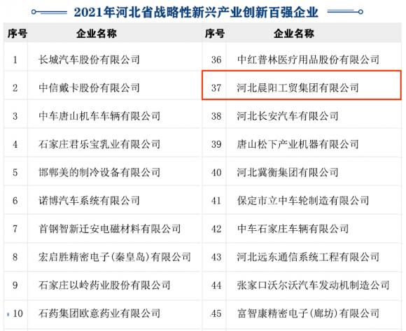 河北晨陽工(gōng)貿集團榮膺“2021年河北省戰略性(xìng)新興產業創新企業百強”